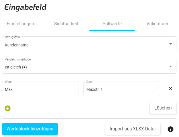 Die Festlegung der gewünschten Werte kann im Formular-Designer in der Vorlage selbst vorgenommen werden. Gehen Sie dort in die Einstellungen eines Eingabefelds und dort auf den Reiter “Sollwerte”. Hier können Sie Werteblöcke definieren und diese mit Wenn-Dann-Regeln befüllen.